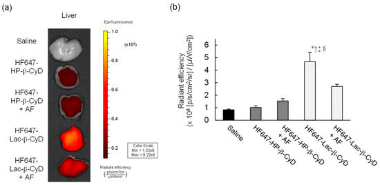 In vivo fluorescence imaging of HF647-Lac-β-CyD. (a) Liver accumulation of HF647-Lac-β-CyD and HF647-HP-β-CyD. The liver was harvested 60 min after subcutaneous administration of HF647-Lac-β-CyD (20 mg/kg) or HF647-HP-β-CyD (10 mg/kg) to WT mice, and fluorescence intensity of the liver was detected by IVIS. These figures show the representative images of 3 mice. (b) Effect of ASGPR on liver accumulation of HF647-Lac-β-CyD. AF (500 mg/kg) was intraperitoneally administered to WT mice 1 min before and 5 min after subcutaneous administration of HF647-Lac-β-CyD. After 60 min, the liver was harvested, and the fluorescence intensity was detected by IVIS.