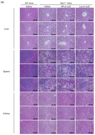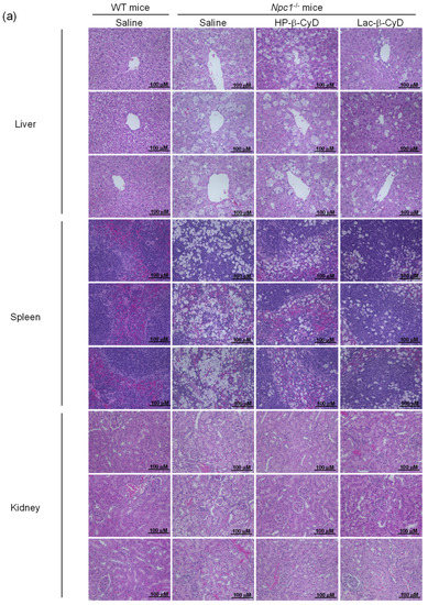 Parent β-CyD may cause renal toxicity after parenteral administration due to its inherent low solubility. Therefore, parent β-CyD is not suitable for systemic administration. To investigate whether Lac-β-CyD causes renal injury or acute toxicity, we determined the plasma levels of BUN and LDH. As shown in Figure 4g, treatment with a high dose of HP-β-CyD markedly increased BUN levels, compared to saline (control), indicating the induction of renal injury in WT mice, although BUN levels in Lac-β-CyD-treated mice were lower than those in HP-β-CyD-treated mice. In addition, a high dose of HP-β-CyD significantly increased LDH levels compared to saline (control) and that of Lac-β-CyD. Taken together, these results suggest that Lac-β-CyD is likely to have lower toxicity than parent β-CyD and HP-β-CyD, and promising, therefore, for a safer drug candidate for NPC treatment.