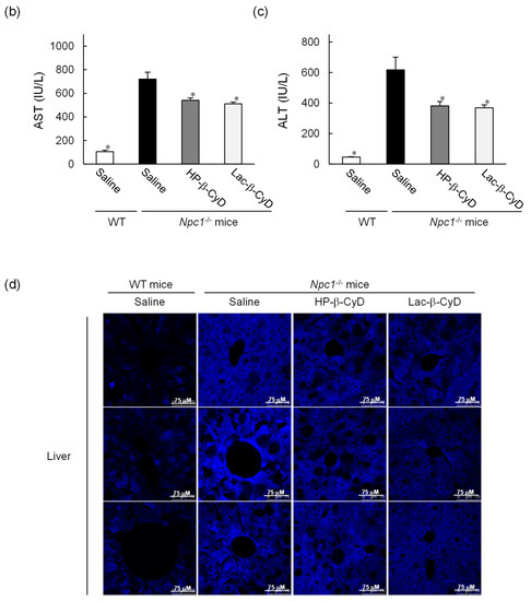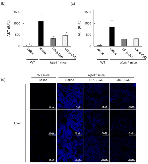 The Npc1−/− mice exhibit various phenotypes, such as vacuolization of several tissues and elevation of ALT as hepatic injury markers. In our study, a number of vacuoles were observed in histological sections of the liver tissue of Npc1−/− mice, probably due to free cholesterol accumulation in hepatocytes (Figure 2 and Figure 3). Lac-β-CyD lowered free cholesterol accumulation in the hepatocytes (Figure 2d and Figure 3d), resulting in a decreased number of vacuoles in the liver tissue (Figure 2a and Figure 3a) and an improvement in the hepatic injury markers of ALT (Figure 2b,c and Figure 3b,c). In addition, we demonstrated that Lac-β-CyD accumulated in the liver after subcutaneous administration (Figure 1). Furthermore, our in vitro cellular uptake study suggests that Lac-β-CyD can enter the hepatocytes through its interaction with ASGPR, specifically expressed on hepatocytes (Figure 5). We postulate that Lac-β-CyD reduces vacuolization in the liver tissue of Npc1−/− mice due to its cholesterol lowering effect on hepatocytes after uptake into the cells. Meanwhile, these results may correlate with toxicity reported in Figure 7. It can be thought that 8 mmol/kg of HP-β-CyD is more toxic than Lac-β-CyD but maybe HP-β-CyD is more efficient to trap the membrane cholesterol.