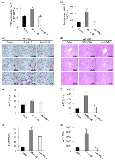 To compare the side effects of Lac-β-CyD and HP-β-CyD in vivo, their effects to the lungs and livers of WT mice after high dose treatment were evaluated. Lac-β-CyD or HP-β-CyD was administered to eight-week old WT mice at 8 mmol/kg, a dose 11 times higher than the therapeutic dose (Figure 2 and Figure 3). After 8 h, the total cell count and total protein concentration in bronchoalveolar lavage fluid (BALF) were analyzed, histopathological effects on lungs and liver were assessed, and blood levels of AST, ALT, BUN, and LDH were measured (Figure 4). As shown in Figure 4a, treatment with a high dose of HP-β-CyD significantly increased the total cell count in BALF, including inflammatory cells, an indicator of pulmonary toxicity. In contrast, there was no significant difference between the control group and the high dose Lac-β-CyD group. Similarly, the total protein concentration in BALF was significantly increased by a high dose treatment of HP-β-CyD. Meanwhile, the total protein concentration in BALF in the Lac-β-CyD group was comparable to that in the control group.