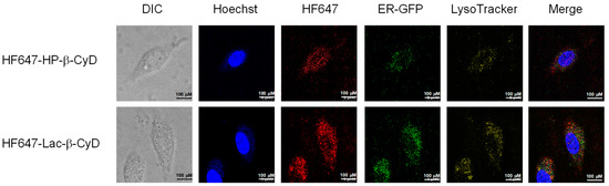 In NPC cells, there is a defect in cholesterol trafficking from the endolysosomes to the endoplasmic reticulum (ER), resulting in cholesterol accumulation in the endolysosomes. Therefore, the subcellular localization of Lac-β-CyD is another crucial factor for determining its therapeutic efficacy in NPC disease. To investigate the subcellular localization of HF647-Lac-β-CyD in the NPC-like liver cells, the endolysosomes and ER were stained with specific indicators, LysoTracker® and ER-GFP, respectively, and the resulting fluorescence was observed by confocal laser scanning microscopy. Notably, most of the intracellular HF647-Lac-β-CyD was colocalized with endolysosomes (Figure 5; shown in yellow). Furthermore, some colocalization of HF647-Lac-β-CyD with both endolysosomes and ER was observed, suggesting that Lac-β-CyD may be distributed in ER-endolysosome membrane contact sites (Figure 5). Collectively, the data indicate that Lac-β-CyD enters the NPC-like liver cells via ASGPR-medicated endocytosis and may be distributed to the endolysosomes and ER.