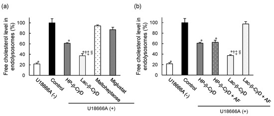Additionally, to investigate the involvement of ASGPR in the cholesterol-lowering effect of Lac-β-CyD, we examined Filipin III fluorescence after Lac-β-CyD or HP-β-CyD treatment in the presence or absence of AF (Supplementary Figure S1b, Figure 6b). The cholesterol lowering effect of Lac-β-CyD was drastically impaired by co-treatment with AF, indicating that ASGPR-mediated endocytosis of Lac-β-CyD is important to lower free cholesterol levels in endolysosomes of the cells. On the other hand, the intensity of Filipin III fluorescence after treatment with HP-β-CyD did not change following the co-treatment of HP-β-CyD with AF. Based on these results, we postulate that Lac-β-CyD decreases the accumulation of free cholesterol in endolysosomes of NPC-like liver cells via ASGPR-mediated endocytosis.