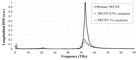 Figure 3 shows the variation of the PDOS with frequency for the pristine and defective 3WCNT, indicating the characteristic peak at around 53.1 THz, being in an excellent agreement to the reported value in other literature [26,47,48,50]. There is a significant drop in PDOS peaks, justifying the reduction in the thermal conductivity of the CNTs in the presence of vacancies [51]. The peak’s frequency shows no sign of dependency on the vacancy concentration that is also in alignment with [10].