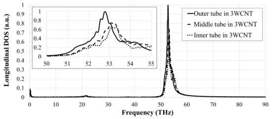 Normalized PDOS curves for each tube in a 3WCNT. The inset shows the curves for the frequency of 50–55 THz.