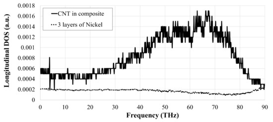 Figure 6 shows the variation of the thermal conductivity with the number of atomic layers of Nickel coating for various vacancy concentrations, i.e., pristine 3WCNT, 0.5%, and 1%. The curve for the models with a pristine 3WCNT is taken from our recent publication [32]. The thermal conductivity of a bulk nickel is also included in this figure. It is interesting that the thermal conductivity of nickel is size dependent on nano size-scale. This is in good agreement with [52], where the thermal conductivity of Ni nanoparticles was shown to be size-dependent. As a result of the rule of mixture, the thermal conductivity of the metal-coated 3WCNT is between that for 3WCNT, and the thermal conductivity of the nickel tube. A drop in the thermal conductivity, with the coating thickness is linked to the rule of mixture, and also impeding of vibrations of the carbon atoms in the outer tube by the heavier Ni atoms deposited on them, which leads to phonon scattering at the interface of the two elements [32,53]. Figure 7 shows the variation of PDOS for the 3WCNT and also for the nickel coating when 3 atomic layers of nickel was deposited on the CNT. A significant drop is seen for the PDOS of the 3WCNT, when compared to a CNT, without any coating (see Figure 3). Also, there is almost no region of significant shared PDOS for the metal and the 3WCNT to imply phonon-phonon coupling between them [46,49]. Noting that the phonon scattering remains constant with the coating thickness [54], the decrease in the thermal conductivity of the composite with additional nickel is attributed to the intrinsic lower thermal conductivity of the nickel coating [32].