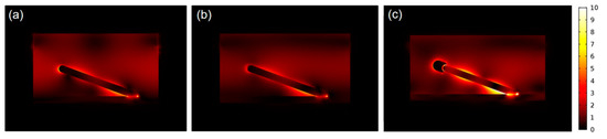 Localized electric field intensity distributions (indicated by the color bar) of (a) AgNRs, (b) AgNRs-10Al2O3; and (c) AgNRs-10Al2O3-150Ag, respectively.
