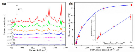 - Xiao, G.; Man, S. Surface-enhanced Raman scattering of methylene blue adsorbed on cap-shaped silver nanoparticles. Chem. Phys. Lett. 2007, 447, 305–309. [Google Scholar] [CrossRef]
