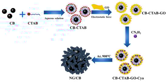 First, 50 mg GO (Suzhou TANFENG graphene Tech Co., Ltd., Suzhou, China) was ultrasonically dispersed in deionized water for 30 min to obtain a concentration of 2 mg·mL−1. CB (Vulcan XC-72, Cabot) was added into 0.1 mg·mL−1 of CTAB solution to reach a mass ratio of 5:1 (CB:CTAB), and the suspension was ultrasonicated for 30 min to obtain well-dispersed CB/CTAB solution. The two suspensions with certain volumes were carefully mixed to get a mass ratio of GO and CB from 1:1 to 20:1 under continuous stirring at 150 rpm. After stirring for 30 min, 2 mL of cyanamide solution (50 wt.% in water, Sigma-Aldrich, St. Louis, MO, USA) as nitrogen source was added into the mixture and stirred for another 30 min at the same rate. Water was then removed by rotary evaporation, and the product was completely dried in an oven at 95 °C overnight. The dried solid was ground and pyrolyzed following a temperature program reported previously [10,40]. Finally, the products were washed with deionized water and then lyophilized overnight. The obtained materials were denoted as NG/CB-x, where x is the mass ratio of GO to CB, x = 1, 2, 5, 10, and 20.
