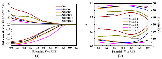 CB addition into NG is expected to influence the electrochemical performance of NG/CB-x composites, which was investigated by means of RRDE tests. Figure 2a demonstrates the overlaid RRDE results of all NG/CB-x electrocatalysts. As clearly shown in this figure, the CB addition can evidently increase the ORR current and decrease the ring current in comparison with pristine NG. The result suggested that CB addition can expectedly improve the electrical conductivity of NG/CB-x composites. The decreased ring current of NG/CB-x composites was indicative of lesser H2O2 was formed during the process of oxygen reduction on disk electrode compared with NG. Therefore, the efficiency of ORR on NG/CB-x composites was enhanced in comparison with NG. Higher electron-transfer number of NG/CB-x composites than that of NG was also expected. The highest ORR current and lowest ring current relative to NG/CB-10 was observed, which illustrated that this electrocatalyst can catalyze ORR with the highest efficiency. The superior current performance of NG/CB-10 was possibly due to the abundant active sites for O2 adsorption and reduction.