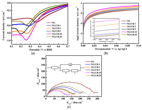 Half-cell tests of NG/CB-x electrocatalysts in O2-saturated 0.1 M PBS (electrocatalyst loadings of NG/CB-x were 15 mg cm−2): LSV curves (a) Tafel plots ((b) inset: linear fitting in the overpotential interval of 80 and 100 mV), and EIS tests ((c) inset: equivalent circuit).