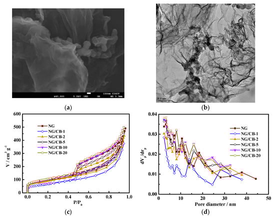 SEM (a) and TEM (b) images of NG/CB-10, and N2 adsorption and desorption isotherms (c) and pore size distribution curves (d) of NG/CB-x electrocatalysts.