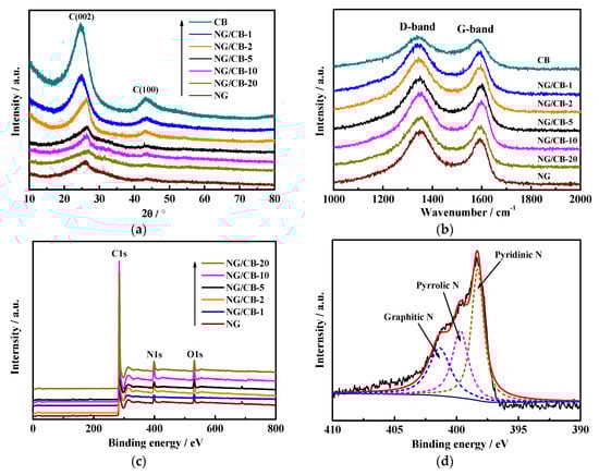 XRD (a), Raman (b) spectra and XPS survey (c) of NG/CB-x electrocatalysts, and high resolution of N1s of NG/CB-10 (d).
