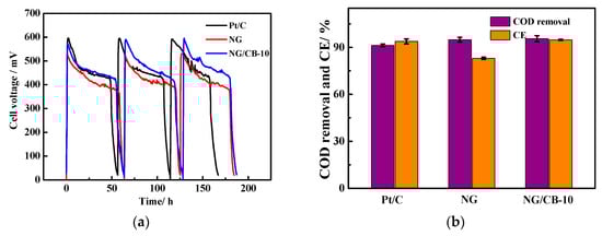 Pristine NG and NG/CB-10 along with commercial Pt/C were used as cathode electrocatalysts at the same loading of 2.5 mg·cm−2 in dual-chamber air-cathode MFCs. As shown in Figure 6a, the maximum voltage of MFCs equipped with different electrocatalysts followed the order: Pt/C (593 mV) > NG/CB-10 (585 mV) > NG (523 mV). The order of maximum cell voltage was in agreement with that of ORR onset potential of these electrocatalysts. The COD removals of these MFCs were almost identical to each other (Figure 6b), indicating similar degradation efficiency of organic compounds. Nevertheless, the values of CE showed significant difference among these MFCs. The NG-MFC showed the lowest CE, whereas the Pt/C-MFC showed the highest value. The CE of NG/CB-10-MFC was almost identical to that of Pt/C-MFC. The difference in electrocatalytic activity of cathode was responsible for the difference of CE due to the same cell configuration, anode material, and inoculation procedures. The result suggested that the electrocatalytic activity of NG/CB-10 cathode was enhanced in comparison with NG cathode, which was in agreement with the result of electrochemical characterization.