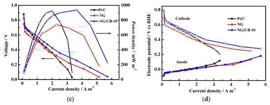 Power generation is one of the most significant evaluation parameters of MFC performance. The polarization and power density curves of the MFCs are shown in Figure 6c. As shown in the polarization curves, the MFC equipped with NG/CB-10 generated an OCV of 0.822 V, which was slightly lower than that of Pt/C (0.880 V) but higher than that of NG (0.748 V). The discrepancy in the value of OCV was ascribed to the different electrochemical performance of these electrocatalysts. CB addition to NG reduced the overpotential of air-cathode and resulted in high OCV. The maximum power density of MFC using NG/CB-10 displayed the highest value of 936 mW·m−2, which was 26% higher than that of pristine NG (740 mW·m−2) and comparable to that of Pt/C (925 mW·m−2). Furthermore, the cell internal resistance was obtained from power density curves showed the following order: NG/CB-10 < Pt/C < NG. CB addition is suggested to increase the conductivity of NG/CB-10 and improve electron transport, resulting in lower internal resistance. The electrode potentials shown in Figure 6d illustrated that the cathode performance played a critical role in the power generation of MFCs due to the identical anode potential curves among all electrocatalysts. The cathode potential at open circuit positively shifted from 0.68 V (vs. RHE) of NG to 0.75 V (vs. RHE) of NG/CB-10, thereby increasing the OCV of MFCs.