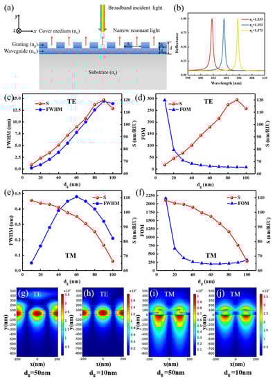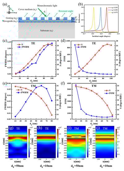 TE and TM polarization have different performances when d is fixed at 100 nm. To investigate the different performances between TE and TM polarization, the COMSOL Multiphysics 5.2a (COMSOL Inc., Stockholm, Sweden) software was used to calculate the field distributions of resonant positions. Figure 1g,h, respectively, show the electric field distributions of TE polarization when dg is 50 nm and 10 nm. The electric fields are mainly stored in the waveguide layer. Therefore, a thick waveguide layer confines more electric energy, which results in a narrower resonant linewidth but reduces the sensitivity. Therefore, the value is mainly attributed to a narrow linewidth of 0.016 degrees at the cost of sensitivity, although a higher FOM of 881 was obtained for TE polarization. For the TM case, most electric energy is not confined in the waveguide layer and is distributed in the cover medium and substrate, as shown in Figure 1i,j. In the case where dg = 50 nm, up to 70.65% of the total resonance energy is distributed in the substrate, which is 82.56% of the total evanescent energy, and only 19.55% of the total resonance energy is distributed in the cover medium, which is 17.44% of the total evanescent energy. In the dg = 10 nm case, 62% and 25% of the total resonance energy is distributed in the substrate and cover medium, respectively, which respectively contain 69.72% and 30.38% of the total evanescent energy. Therefore, the evanescent energy increases by almost 13%, which leads to a higher angular sensitivity. Meanwhile, an obvious increase in the maximum electric intensity from 9.27 × 105 V/m (dg = 50 nm) to 4.44 × 106 V/m (dg = 10 nm) is observed for TM polarization, as shown in Figure 1i,j. This indicates that more energy was confined in the structure, thus decreasing the resonant linewidth. This result can also be proven by referencing [46], because the grating groove depth controls the coupling-loss coefficient in an exponential manner, thus the coupling-loss coefficient tends to be smaller as dg decreases. Therefore, when d is fixed at 100 nm for TM polarization, a shallow dg facilitates a narrow linewidth, and a relatively thick dwg (near 90 nm) also results in a higher sensitivity. A much higher FOM will be obtained thanks to the higher sensitivity and narrower linewidth.
