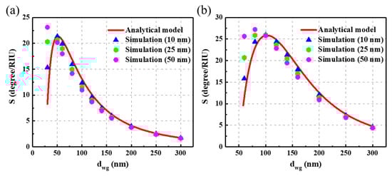 To explain this phenomenon, we used the previous angular model to calculate Sa. The red curve in Figure 2a depicts the Sa of TE polarization, and a higher sensitivity region is located near dwg = 50 nm. The curved sensitivity line of TM polarization has the largest sensitivity region near dwg = 100 nm, as shown in Figure 2b. The highest sensitivity is 25.9 degrees/RIU (refractive index unit), which is very close to the highest sensitivity value in Figure 1f for TM polarization. Moreover, this largest sensitivity region dwg = 100 nm is the same as the value of the total depth of the grating and waveguide layer d that we set in Section 3.1. Combined with these results, the extremely high FOM accompanied by a high sensitivity and narrow linewidth shown in Figure 1f can be explained as follows: a shallower dg facilitates a narrower linewidth and a thicker dwg, approaching the highest sensitivity region (100 nm) and resulting in higher sensitivity.