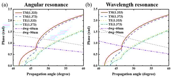 Phase shift curve in waveguide layer at different propagation angle, (a) angular resonance, (b) wavelength resonance.