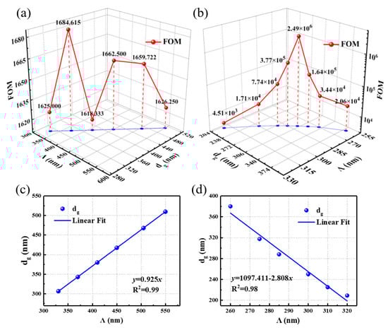 Different Λ were chosen to determine the dg value that lead to a superior FOM. For wavelength resonance, different Λ varying from 330 nm to 550 nm, were chosen to calculate the position at which there is a minimum resonant linewidth and higher sensitivity for TE polarization, as shown in Table 3. The relationship among Λ, dg, and the corresponding FOM is depicted in Figure 6a.