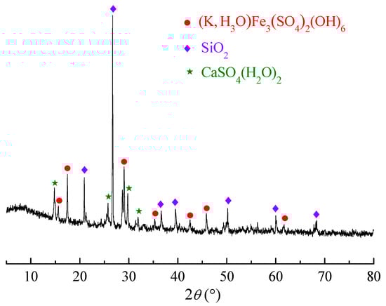 Manganese residue was provided by Qinzhou Xiangda Chemical Co., Ltd. (Guangxi, China). The chemical compositions of the manganese residue are listed in Table 1, and Figure 1 presents the main mineralogical structures and phases, including compound sulfate ((K, H3O)Fe3(SO4)2(OH)6), SiO2, and CaSO4(H2O)2. Cassava starch was supplied by Guangxi State Farms Mingyang Biochemical Group, INC (Nanning, China). Safranine T was purchased from Tianjin Kemiou Chemical Reagent Co., Ltd. (Tianjin, China). All other chemical reagents (analytical grade) were obtained from commercial sources and used without further purification. Deionized water was used throughout the experiments.