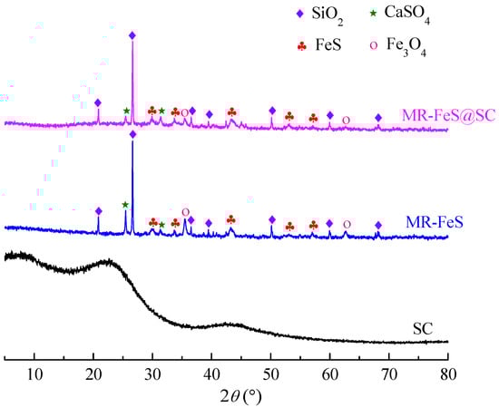 The crystal structure of the samples was investigated by XRD analysis, and the XRD patterns of SC, MR–FeS, and MR–FeS@SC are presented in Figure 2. The pattern of SC shows broad peaks at approximately 20–26° and 42–45°, which are indexed to (002) and (101) diffraction planes of disordered carbon, respectively, indicating that the SC were mainly amorphous and had a highly disordered structure [21,29]. The XRD patterns of MR–FeS and MR–FeS@SC exhibit several sharp diffraction peaks, which are mainly different from those presenting in the raw manganese residue. The main crystalline phases were identified as FeS, SiO2, Fe3O4, and CaSO4, indicating that the phase transition occurred in the calcination process of manganese residue. FeS was successfully formed with or without the addition of starch. In addition, Fe3O4 was also formed during the calcination, which could impart magnetic properties to the adsorbents for easy separation from the solution.