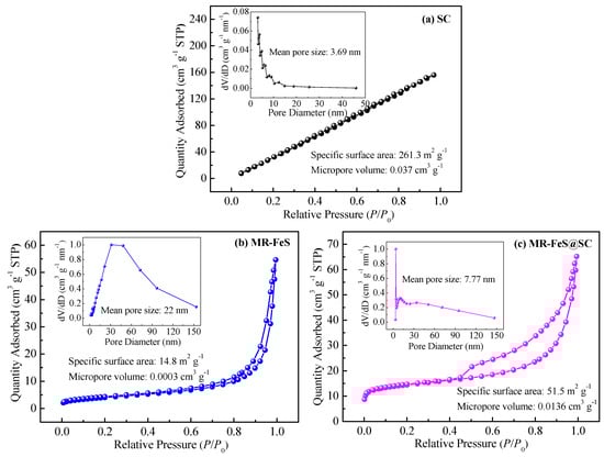N2 adsorption–desorption isotherms and pore distributions of (a) SC, (b) MR–FeS, and (c) MR–FeS@SC.