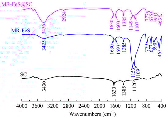 FTIR analysis was performed to qualitatively investigate the chemical functionalities of different samples, and the spectra are shown in Figure 5. In the spectrum of SC, a strong broad band centered at 3430 cm−1, and the peaks at 1630, 1385, and 1120 cm−1 were assigned to stretching vibration of –OH groups, stretching vibration of C=O, C–H bending, and stretching vibration of S=O (–SO3H), respectively [1,30,31,32], which were originated from the characteristics of starch and p-toluenesulfonic acid. Without the interaction of other substances, SC prepared by the carbonization of pure starch gel lost a large number of functional groups. In the spectrum of MR–FeS, the bands at 3425, 1630 and 1593, and 1385 cm−1 were assigned to stretching vibration of –OH groups, stretching vibration of C=O, and C–H bending, respectively, which were originated from the introduction of p-toluenesulfonic acid. The peaks at 1153 and 1109 cm−1 were attributed to the asymmetric absorption vibration of Si–O–Si and antisymmetric bridge stretching of C–O [1], and the peaks at 779, 677, and 465 cm−1 were attributed to bending vibration of Si–O, which confirmed the presence of SiO2 in MR–FeS. A peak at 590 cm−1 corresponded to the essential characteristic adsorption peak of Fe3O4 [33]. The spectrum of MR–FeS@SC nanocomposite shows the characteristic adsorption peaks as those in the spectra of SC and MR–FeS. With the interaction of manganese residue, the MR–FeS@SC prepared from the carbonization of the mixture of manganese residue and starch could retain more functional groups of starch. Moreover, the shift of these characteristic adsorption peaks in the spectrum of MR–FeS@SC compared with those in the spectra of SC and MR–FeS could be observed. A blue shift of the stretching vibration of –OH groups at 3436 cm−1 in the spectrum of MR–FeS@SC from 3430 cm−1 in SC and 3425 cm−1 in MR–FeS indicated the interaction between SC and MR–FeS through hydrogen bonds [34]. A blue shift of the stretching vibration of C=O at 1630 and 1603 cm−1 in the spectrum of MR–FeS@SC from 1630 and 1593 cm−1 in that of MR–FeS could also be observed, implying that the stable combination between SC and MR–FeS though the action of C=O. In addition, red shifts of the characteristic peaks of Si–O and C–O at 1149, 1107, 777, 675, and 463 cm−1 in the spectrum of MR–FeS@SC from 1153, 1109, 779, 677, and 465 cm−1 in that of MR–FeS indicated the presence of steric hindrance for combining SC and FeS though Si–O and C–O bonds. As the stable combination between SC and MR–FeS, the characteristic peak of Fe3O4 became weaker in the spectrum of MR–FeS@SC. FTIR analysis confirmed that MR–FeS nanoparticles were firmly combined with SC in the MR–FeS@SC nanocomposite though the bonding force of oxygen-containing groups, including –OH, C=O, C–O, Si–O, S=O, etc. The abundant functional groups in MR–FeS@SC nanocomposite are also beneficial to the improvement of its adsorption performance.