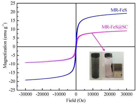 The magnetic properties of MR–FeS and MR–FeS@SC were examined by VSM at room temperature. Figure 6 shows that the saturation magnetization values for MR–FeS and MR–FeS@SC were determined to be 19.17 and 9.13 emu∙g−1, respectively. The saturation magnetization of MR–FeS@SC was lower than that of MR–FeS, probably owing to that SC was a nonmagnetic material and thus reduced the saturation magnetization of the nanocomposite. The reduction of saturation magnetization did not affect the separation of MR–FeS@SC from the aqueous solution system as the nanocomposite still exhibited superparamagnetic properties. The inset picture in Figure 6 shows that MR–FeS@SC nanocomposite was quickly separated from the aqueous solution by a magnet (external magnetic field) after becoming adsorption-saturated in the ST solution. The magnetic responsivity would be beneficial to the reuse of the adsorbents for applying in wastewater treatment [35].
