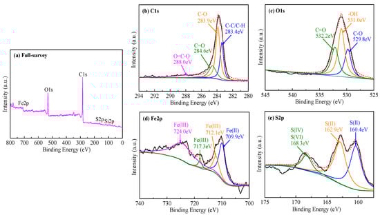 The stoichiometric composition and chemical states of MR–FeS@SC nanocomposite were measured by XPS technique, and the results are presented in Figure 7. The full-survey spectrum (Figure 7a) shows that the main elements were C, O, Fe, Si, and S. The high-resolution C 1s, O 1s, Fe 2p, and S 2p XPS spectra provided detailed information referring to the surface chemistry. The C 1s spectrum was deconvoluted into four peaks at approximately 283.4, 283.9, 284.6, and 288.0 eV (Figure 7b), which were assigned to C–C/C–H, C–O, C=O, and O=C–O, respectively [29,36]. The O 1s core-level peak could be fitted into three peaks at 529.8, 531.0, and 532.2 eV (Figure 7c), ascribed to C–O, –OH, and C=O, respectively [12]. As shown in Figure 7d, the high-resolution Fe 2p spectrum was deconvoluted into four peaks. The binding energy at around 709.9 eV was the characteristic peak of Fe(II); the binding energies at approximately 712.1 and 717.3 eV were the characteristic peaks of Fe(III); the binding energies at around 724.0 eV was the characteristic peak of Fe(III)–O [37]. These characteristic peaks were mainly originated from FeS and Fe3O4, which is consistent with the XRD result. Figure 7e illustrates the high-resolution S 2p spectrum, which was deconvoluted into three peaks. The binding energies at approximately 160.4 and 162.9 eV were the characteristic peaks of S(II), ascribed to FeS; the binding energy at 168.3 eV was the characteristic peak of S(Ⅳ) and S(Ⅵ), ascribed to O–S–O and SO42− (CaSO4). Therefore, these XPS results are in good agreement with the results of FTIR and XRD.