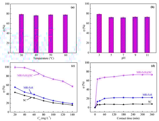 Commonly, temperature is considered as one of the main factors for affecting the adsorption process. The increase in temperature can lead to the decrease in the viscosity of the solution, which thus increases the diffusion rate of the adsorbate molecules across the external boundary layer and in the internal pores of the adsorbent particles [38]. Moreover, the equilibrium capacity of the adsorbent can be changed at different temperature for a particular adsorbate [10]. Herein, MR–FeS@SC nanocomposite was used to investigate the effect of temperature on the removal efficiency of ST, and the result is presented in Figure 8a, which shows that temperature did not have obvious effect on the adsorption capacity of MR–FeS@SC nanocomposite. This may be due to that the increased temperature was helpful to promote the diffusion of adsorbate into the adsorbent, but the adsorbate molecules were easy to be desorbed simultaneously. As a result, changing the temperature in a certain range had little effect on the adsorption process. It is optimum to operate the adsorption at room temperature (30 °C).