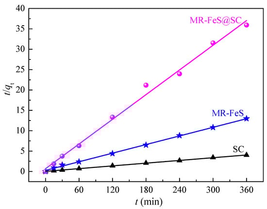 The parameters of the pseudo-second-order models for different adsorbents are shown in Table 2. The correlation coefficients (R2) values for the adsorption of ST onto SC, MR–FeS, and MR–FeS@SC were 0.9957, 0.9995, and 0.9996, respectively, indicating that the pseudo-second-order model fitted the experimental kinetic data well. In addition, the qe(cal) values calculated from the pseudo-second-order model were in good agreement with the experimental values qe(exp). These results demonstrate that the adsorption of ST by these three adsorbents was mainly chemisorption. It can be concluded that the rate step of adsorption was limited by chemical interaction, including valence forces involving exchanging or sharing electrons between the adsorbate and the adsorbent [41]. Moreover, the equilibrium adsorption capacity of MR–FeS@SC was more than three times that of MR–FeS and nine times that of SC, which were mainly attributed to the synergetic action between the functional groups of SC and MR–FeS nanoparticles.