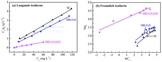 (a) Langmuir and (b) Freundlich isotherms for the adsorption of ST onto SC, MR–FeS, and MR–FeS@SC.
