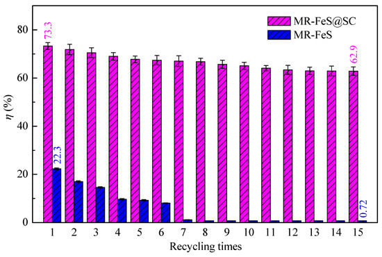 The recyclability of adsorbent is very important to evaluate the economic feasibility and environmental friendliness for practical applications. The reusability of MR–FeS@SC nanocomposite was evaluated by conducting the adsorption–desorption process for fifteen cycles, and the reusability of MR–FeS was also conducted under the same conditions for comparative study. As presented in Figure 11, the removal efficiency of ST adsorbed by MR–FeS@SC nanocomposite slowly decreased as the increase of cycle times, but that by MR–FeS remarkably decreased, especially after six cycles. After fifteen cycles, the removal efficiency of ST adsorbed by MR–FeS@SC could be retained 62.9% (73.3% in the first cycle), but the MR–FeS recycled for over six times almost did not have adsorption capacity. These results confirm that the stability and recyclability of MR–FeS@SC nanocomposite were much higher than those of MR–FeS, which was mainly due to the strong interaction between MR–FeS and the functional groups of SC and the immobilization of MR–FeS nanoparticles onto SC support, reducing the loss of effective and active components. Consequently, the MR–FeS@SC nanocomposite could be considered an efficient and stable adsorbent for the removal of dyes from wastewater in practical applications.