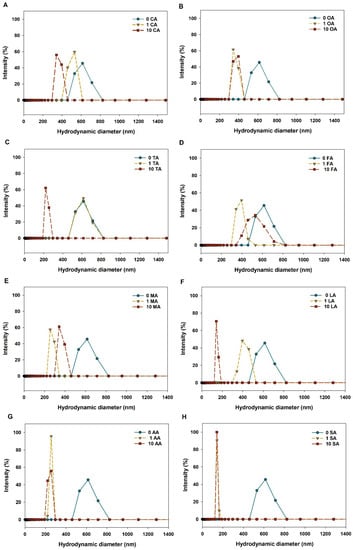 Size distribution of CuO nanoparticles (NPs) (100 mg/L) in aqueous solutions with different low-molecular-weight organic acids (LMWOAs). (A) CA: Citric acid; (B) OA: Oxalic acid; (C) TA: Tartaric acid; (D) FA: Formic acid; (E) MA: Malic acid; (F) LA: Lactic acid; (G) AA: Acetic acid; (H) SA: Succinic acid.