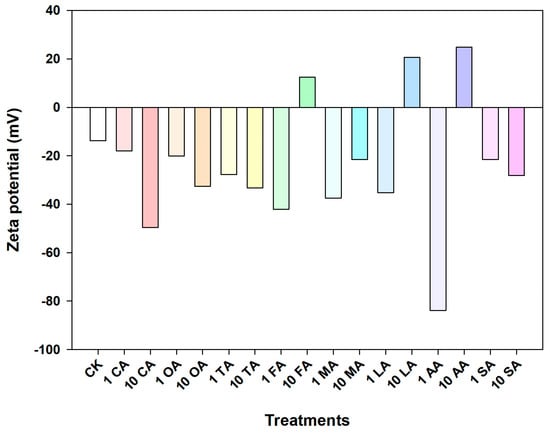 The zeta potential of CuO NPs was detected over a range of LMWOA concentrations as shown in Figure 3. The surface charges of CuO NPs were determined by both the properties of LMWOAs and their concentrations. A negative concentration-dependent effect of citric, oxalic, tartaric, and succinic acids was found on the zeta potential of CuO NPs. Meanwhile, the zeta potential of CuO NPs was reduced from −13.8 mV (control) to even −83.9 mV with low concentrations of formic, lactic, and acetic acids; however, the surface charges of CuO NPs were switched from negative to positive in the presence of increasing concentrations of those three organic acids.