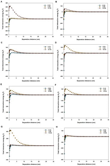 Calculated Derjaguin–Landau–Verwey–Overbeak (DLVO) total interaction energy between two CuO NPs (100 mg/L) in the presence of different LMWOAs. (A) CA: Citric acid; (B) OA: Oxalic acid; (C) TA: Tartaric acid; (D) FA: Formic acid; (E) MA: Malic acid; (F) LA: Lactic acid; (G) AA: Acetic acid; (H) SA: Succinic acid.