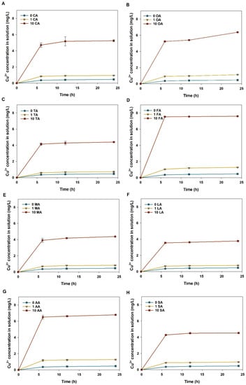 Dissolution of CuO NPs (100 mg/L) in aqueous solutions containing different LMWOAs. The values of Cu concentration are given as mean ± SD of triplicate samples. (A) CA: Citric acid; (B) OA: Oxalic acid; (C) TA: Tartaric acid; (D) FA: Formic acid; (E) MA: Malic acid; (F) LA: Lactic acid; (G) AA: Acetic acid; (H) SA: Succinic acid.