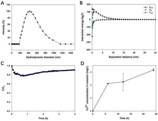Size distribution (A); interaction energy (B); dynamic sedimentation (C); and dynamic dissolution (D) of CuO NPs in the LMWOA mixture.