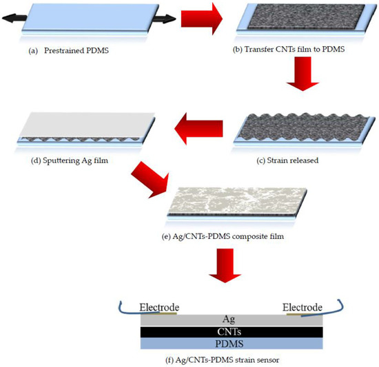 Figure 1 schematically illustrates the key steps for fabricating the flexible Ag/CNTs-PDMS composite film sensor. (1) We prepared CNTs in a self-made floating catalyst chemical vapor deposition (FC-CVD) system and the CNTs film was deposited on Al foil, and its thickness was about 100 nm. (2) We removed the CNTs film from the Al foil by etching in a 1 M HCl aqueous solution, and after the Al foil was dissolved, the CNT film floated on the HCl solution. (3) A PDMS substrate, with around 1 mm thickness, was fixed on a glass slide at one end, and a force was applied to the other end to stretch it for obtaining the pre-strained PDMS. (4) We transferred the CNTs film onto the pre-strained PDMS film and then released the pre-strained PDMS, which resulted in the CNT film becoming a wrinkle structure. (5) We physically deposited the Ag film upon the wrinkled CNTs film via ion sputtering (SBC-12, KYKY, Beijing, China), with the parameters involving distance 5 cm between the sample and the Ag target, and with a sputtering current of 6 mA. (6) We assembled the flexible and wearable sensor.