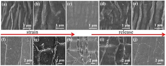 Figure 2 shows the SEM morphologies of the original CNTs and the Ag/CNTs-PDMS composite films under variant tensile strain conditions. It could be seen that the original CNTs film was of a continuous network with a wrinkle structure before it was stretched and became flat when the tensile strain of 10% was applied, and vice versa during releasing, as shown in Figure 2a–e. In addition, it was worth paying attention to the fact that the Ag film deposited on the wrinkled CNTs showed a flat surface when no tensile strain was applied and many micro-cracks and islands appeared alongside the increasing of the tensile strain, and vice versa during releasing, as shown in Figure 2f–j.
