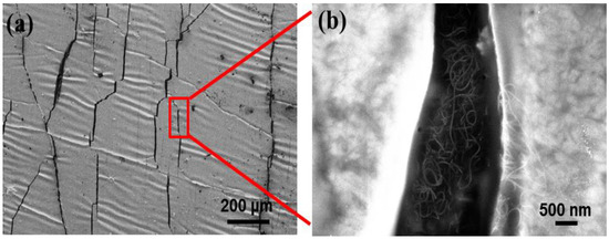 It is well known that the change of the micro-cracks on the Ag film will inevitably generate the variation of its resistance, that is to say, the variation of electric current passing through the Ag film, which is the basic principle of the force-electric effect. However, in the present work, the Ag film was deposited on the specially-treated CNTs film surface with a wrinkled structure. Therefore, it would be very sensitive to any tiny alteration of a force action, i.e., once a very small stress-strain was applied to the Ag/CNTs-PDMS film, a large resistance or current response would be generated, which caused a high sensitivity [22]. In addition, from Figure 3 a local high magnification, the CNTs film kept an integrated structure beneath the Ag film crack. This was because the high strength and network of the CNTs film could inhibit the crack expansion and prevent it from completely cracking, which guaranteed the structural integrity of the overall structure of the sensor during stretching.