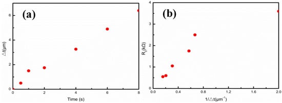 Relationships of the Ag film thicknesses (∆t) with sputtering times and original resistances (R0). (a) ∆t-Time; (b) R0-1⁄∆t.