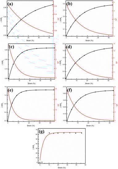 where R0 is determined by the resistance of CNTs and the contact resistance between CNTs and the Ag film, RAg0 is the resistance of the Ag film when there is no strain, RAgc is the resistance factor of the quantum tunneling section, c is a factor related to the quantum tunneling effect, and ε is the strain. RAg0 is inversely proportional to the total thickness of the Ag film, and RAgc is proportional to the thickness of the Ag film torn by strain. By adopting Formula (1) and fitting in each sample, the values of R0, RAg0, RAgc, and c were obtained, respectively. Therefore, the sensitivity of the sensor could be calculated according to the definition , as shown the red lines in Figure 6a–f. In other words, for each sensor, the sensitivity decreased gradually from the maximum value (when the strain was 0) to 0 with increase of strain, which also proved that the present sensor was more suitable for measuring tiny strains, i.e., for monitoring small strains in the human health status [27,28,29,30].