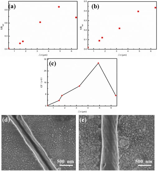 Effects of the Ag film thicknesses (Δt) on the sensitivity of the Ag/CNTs-PDMS composite film sensor. (a) 1⁄RAg0-Δt; (b) 1⁄RAgc-Δt; (c) Gauge factors (GF)-Δt; (d) the Ag film cracked under conditions of 4.9 μm thickness and 5% strain; (e) the Ag film cracked under conditions of 6.4 μm thickness and 5% strain.