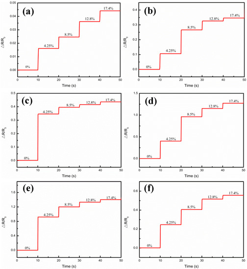 Relative resistance (ΔR/R0) variations under step strains from 0% to 17.4% at different Ag film thicknesses. (a) 0.5 μm; (b) 1.5 μm; (c) 1.75 μm; (d) 3.26 μm; (e) 4.9 μm; (f) 6.4 μm.