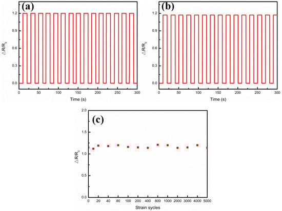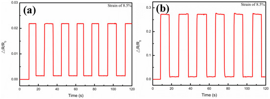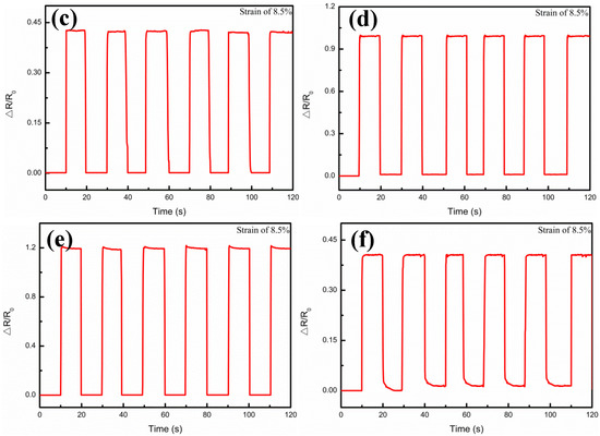 Durability and stability are also of crucial importance to a sensor. Cui et al. [34] reported a flexible pressure sensor with Ag wrinkled electrodes based on a PDMS substrate. The Ag wrinkled electrodes were formed by vacuum deposition on top of the pre-strained and relaxed PDMS substrates, which were treated using an O2 plasma, a surface functionalization process, and a magnetron sputtering process. The adhesion of the Ag to PDMS was improved by pretreatment of the polymer, and the mechanical stability was also provided. Regarding the present work, the measurements for the samples at different strains and Ag film thicknesses are shown in Figure 8, which illustrates the relative resistance variations under step strain from 0% to 17.4% strain, when the Ag film thicknesses were 0.5 μm, 1.5 μm, 1.75 μm, 3.26 μm, 4.9 μm, and 6.4 μm, respectively. It could be seen that when a step strain of 4.25% was applied, the relative resistance (△R/R0) of the composite films was kept almost unchanged in the platform, but sharply magnified at the step edge, and with the increase of the Ag film thickness, it showed the tendency to increase first and then decrease. In addition, Figure 9 illustrates the multicycle tests of the relative resistance (△R/R0) variations, when the Ag film thicknesses were 0.5 μm, 1.5 μm, 1.75 μm, 3.26 μm, 4.9 μm, and 6.4 μm, respectively. When 8.5% periodic strain was applied to each sensor, the △R/R0 curve variations were also periodic and the peak patterns remained no different with the same tendency regarding to different Ag film thickness. These results demonstrated the high stability of the Ag/CNTs-PDMS composite film sensor under the different Ag film thicknesses, due to the fact that the output signal was highly reproducible.