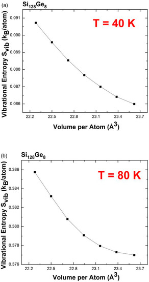 In addition to the macroscopic Grüneisen parameter γ(T) obtained from the weighted average of γj, the volume derivative of the vibrational entropy Svib is another thermodynamic quantity used for examining NTE behavior. This approach for predicting NTE is effective due to two factors. First, the NTE coefficient scales linearly with the volume derivative of the vibrational entropy (written as əSvib/əV). The second reason is that the Si136-xGex system is supposed to be a perfect crystalline lattice, where the temperature-dependent contribution to the entropy arising from lattice vibrations is considered. Meanwhile, other types of anharmonic effects and electronic and magnetic contributions are assumed to be too small and are neglected. This alternative approach for exploring NTE is still within the QHA framework, because the əSvib/əV term contains the information regarding the volume-dependence of the HA-based phonon frequency ωj(q) appearing in the vibrational entropy. In this work, both of these two approaches were applied to verify that the Si-dominated Si128Ge8 (or Si104Ge32) alloy demonstrates the NTE effect at a temperature range that is comparable to that of pure Si136.