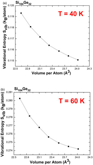 To revisit the NTE behavior by focusing on the so-called entropy-driven effect [8], the Ge concentration x in Si136-xGex was raised from 8 to 32. Figure 11 shows a series of plots of predicted volume-dependent Svib at different temperatures for Si104Ge32. From these continuous curves, the slopes of the vibrational entropy as a function of lattice volume for each line segment are found to be negative at T = 40 K and T = 60 K, respectively, while remaining positive at T = 120 K. Therefore, the NTE phenomenon is found to be present at T = 40 K (and T = 60 K) but vanishes at T = 120 K. It is therefore anticipated that the slopes change their sign from negative to positive at some finite temperature between T = 60 K and T = 120 K, beyond which the disappearance of the NTE phenomenon is expected. The previously predicted NTE temperature range (0—84 K) for Si104Ge32 appearing in Figure 8 indicates that the NTE effect begins to disappear at approximately 87 K which is nearly at the midpoint of the 60–120 K range displayed in Figure 11b,c. Similarly, for the Si128Ge8 alloy, quantities involving ΔSvib/ΔV switch their sign from negative to positive when the temperature is increased from 80 K to 130 K. Additionally, in Figure 8 the upper limit for the existence of NTE is approximately 108 K, similar to the average of T = 80 K and T = 130 K specified in Figure 10a,b. Finally, both of these two approaches utilizing the quasi-harmonic approximation method give rise to a substantially consistent result when predicting anomalous negative thermal expansion behavior at specified temperatures, and specify the approximate T range within which the NTE is present.