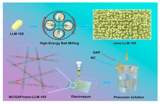 Sketch for the synthesis of the nitrocellulose/glycidyl azide polymer/nano 2,6-diamino-3,5-dinitropyrazine-1-oxide (NC/GAP/nano-LLM-105) composite nanofiber.