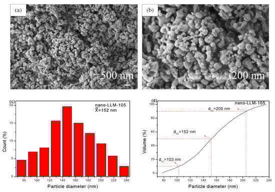(a,b) SEM image of LLM-105 nanoparticles; (c,d) diameter distribution of the LLM-105 nanoparticles.