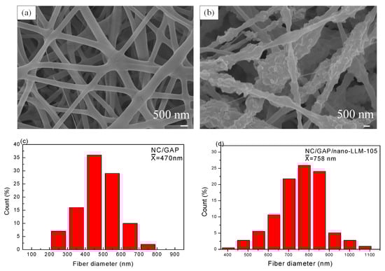 Figure 2a,b reveals that there are some weaker agglomerates rather than hard agglomerates for LLM-105 nanoparticles, and there are no bridge between the particles. The particle diameter distribution is obtained by measuring a diameter of ~100 particles, and the results are displayed in Figure 2c–d. We acquired the volume curve by integrating the frequency curve. The mean diameter calculated from the frequency curve is 152 nm, which is same as the median diameter (d50 = 152 nm) calculated from the volume curve. For the SEM images of NC/GAP and NC/GAP/nano-LLM-105 (Figure 3a,b), it is clearly observed that both of the two nanofibers reveal 3D reticulate structures. The surface of the NC/GAP nanofiber is smooth and uniform. On the contrary, the surface of the NC/GAP/nano-LLM-105 nanofiber is rough and uneven. The difference in morphology is primarily caused by two factors. The addition of LLM-105 nanoparticles results in an inhomogeneity of precursor solution. Furthermore, partial LLM-105 nanoparticles are agglomerated during the electrospinning process. From Figure 3c–f, for NC/GAP nanofibers, the mean diameter and median diameter are 469 nm and 478 nm, respectively. By comparison, the mean diameter and median diameter of NC/GAP/nano-LLM-105 are 758 nm and 764 nm, respectively. It is apparent that the diameter of NC/GAP/nano-LLM-105 is larger than that of the NC/GAP nanofibers. The difference in mean diameter of these two nanofibers is due to the fact that the LLM-105 nanoparticles are loaded onto the surface of NC/GAP.